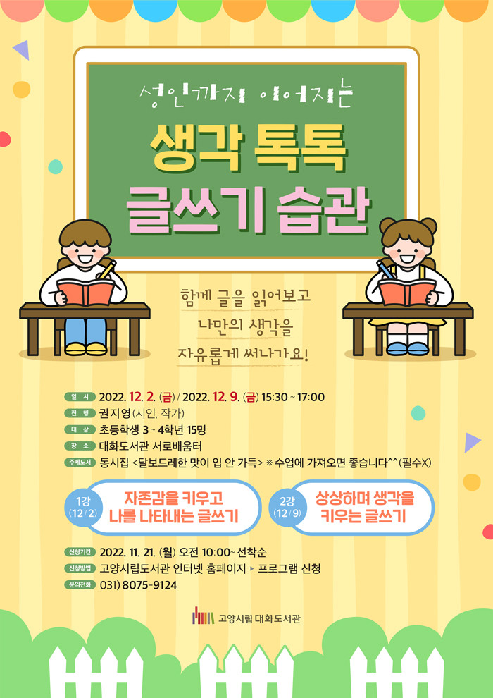 프로그램은 ▲12월 2일‘자존감을 키우고 나를 나타내는 글쓰기’▲12월 9일‘상상하며 생각을 키우는 글쓰기’ 순서로 진행된다.