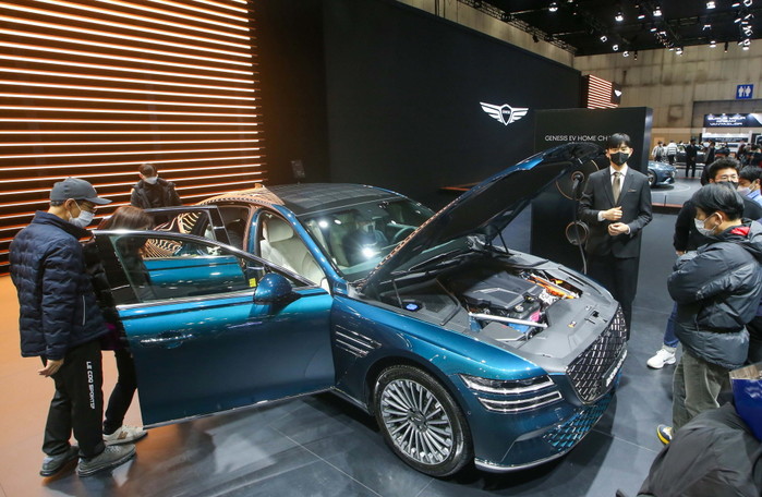 [사진설명] G80 전동화 모델을 살펴보는 관람객들.