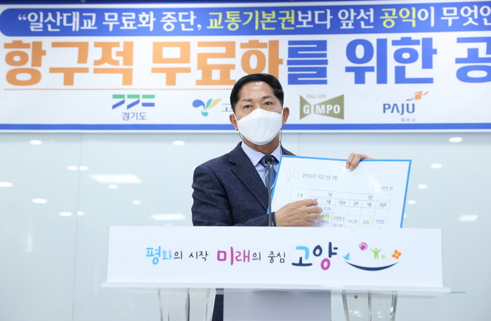 지난 22일 고양시는 일산대교 운영사의 전·현직 대표이사 6명을 경찰에 수사의뢰했다. 사채 수준의 고리 대출 계약을 통한 고의적 손실 야기, 인건비 과다 지급 등 배임 혐의를 제기했다. 한강 다리 가운데 유일하게 통행료를 받아온 일산대교는 지난달 27일 경기도의 공익처분으로 전격 무료화됐지만, 법원이 일산대교 운영사의 가처분 신청을 받아들여 지난 18일 다시 유료화됐다. 시는 일산대교의 항구적 무료화를 이뤄내기 위해 적극 힘쓰고 있다.