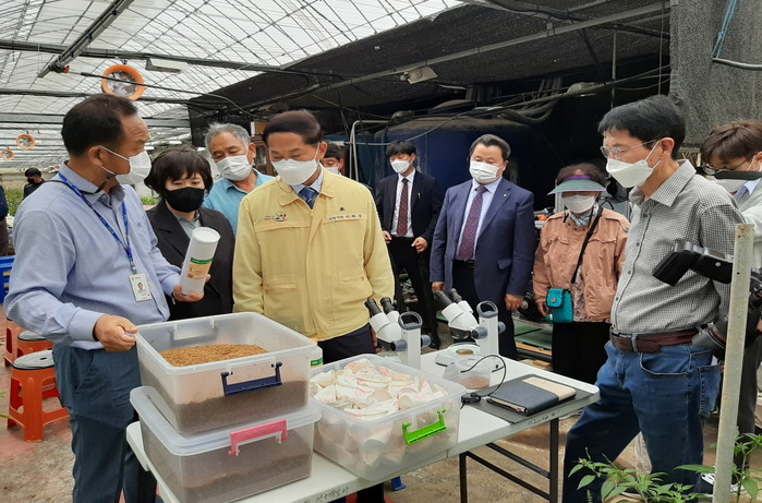 평가회에서는 농업기술센터에서 보급한 ‘뿌리이리응애’(총채벌레 번데기 천적)를 활용한 총채벌레의 방제 효과와 시에서 육성한 장미품종에 대한 품평이 진행됐다.