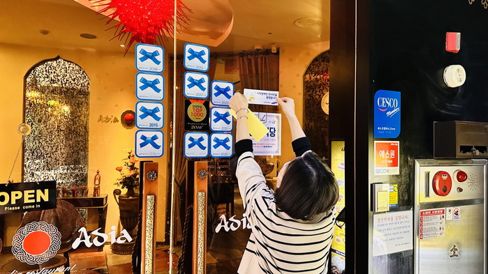 [사진설명] 점포에 장애인 보조견 입장 환영 스티커를 붙이고 있다.