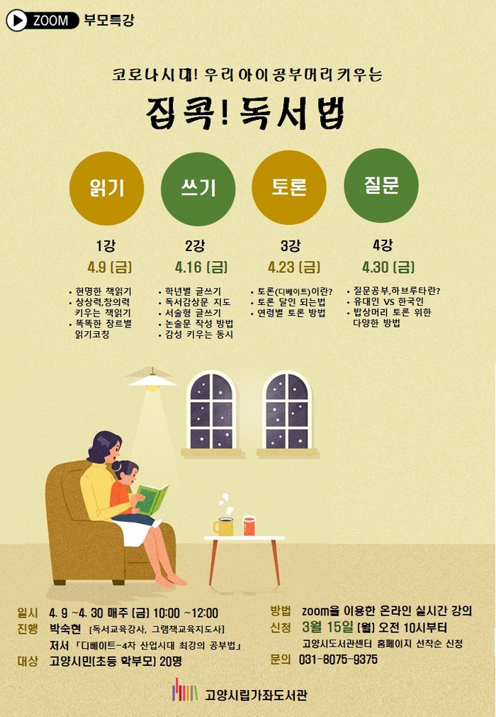 초등학생 학부모인 고양시민 20명을 대상으로 4월 9일 ‘읽기’, 4월 16일 ‘쓰기’, 4월 23일 ‘토론(디베이트)’, 4월 30일 ‘하브루타’ 등의 주제로 총 4회의 강좌를 진행한다.