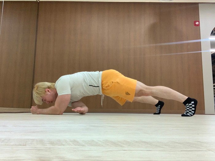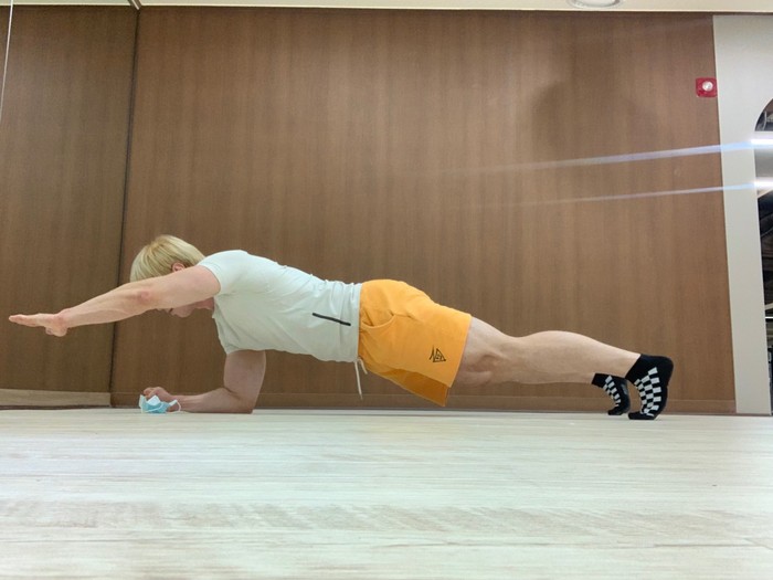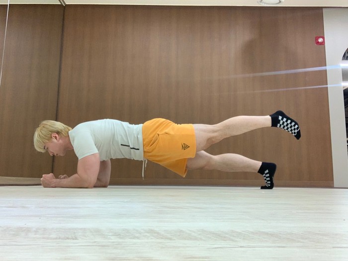 1.엘보우 플랭크 동작에서 한 팔씩 반갈아가며 어깨와 팔이 일직선이 되게 쭉 뻗어준다.
