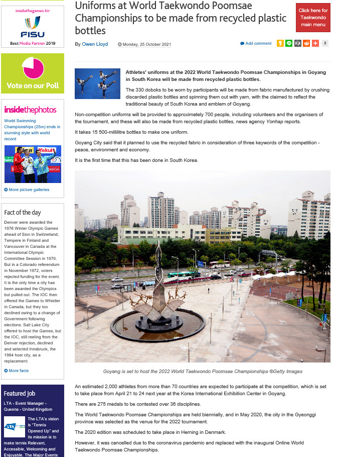 [사진설명] 세계적 스포츠 웹진 ‘Inside the Games’에 실린 2022 고양 세계태권도품새선수권대회 폐페트병 활용한 유니폼에 대한 기사. WT 등에 이 유니폼에 대한 문의가 쇄도했다.