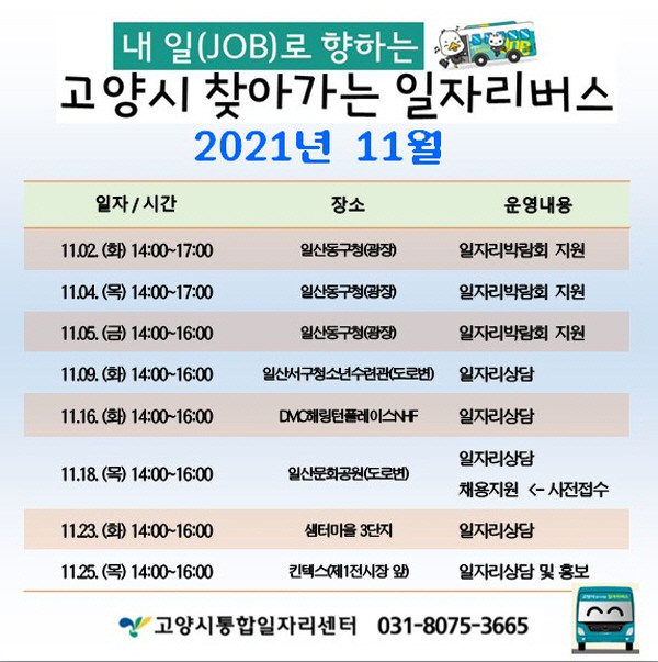 시는 작년 봄부터 아파트 단지 방문을 중단했던 찾아가는 일자리버스를 11월부터 재개할 예정이다. 11월 16일 덕양구 향동 DMC해링턴플레이스NHF 단지를 시작으로 11월 23일 덕양구 샘터마을 3단지를 방문한다.