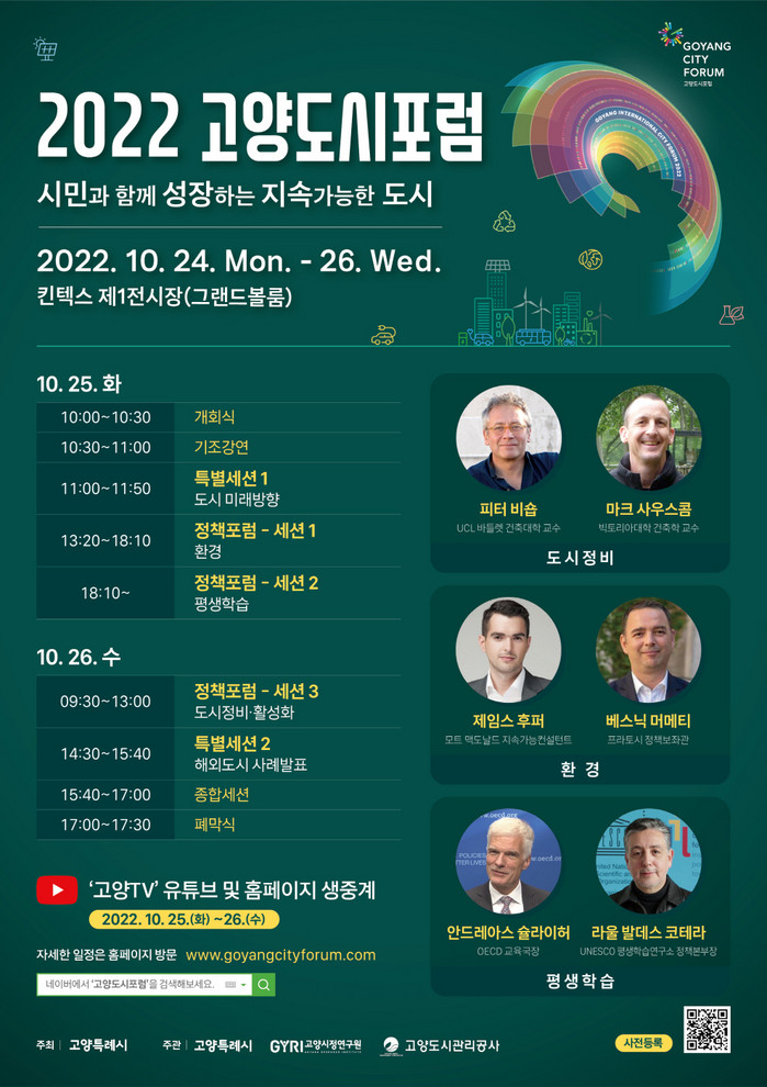 2022고양도시포럼에 참석하는 연사들은 ▲UCL Battlet school 건축학 교수 피터 비숍 ▲뉴질랜드 빅토리아 대학 건축학 교수 마크 사우스콤 ▲OECD교육국장 안드레아스 슐라이허 ▲지구환경과학 박사이자 방송인 제임스 후퍼 등이다.