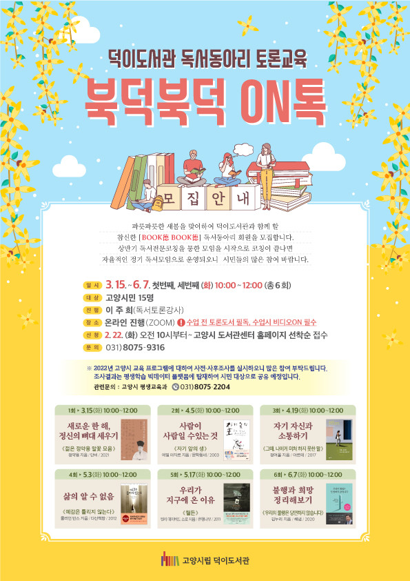 '북덕북덕 ON톡' 강좌에 참여할 고양시민은 오는 2월 22일 오전 10시부터 고양시도서관센터 홈페이지에서 참여 신청할 수 있다. 기타 궁금한 사항은 덕이도서관 문화행사 담당자에게 문의하면 된다.