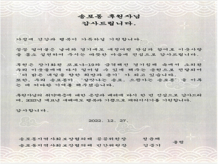 김중기 송포동 지역사회보장협의체 위원장은“사회와 경제적으로 어려운 요즘이지만 살맛나는 송포동을 위해 관심을 가져주시는 후원자들에게 늘 감사한 마음이며, 새해에는 더 많은 우리 이웃들의 눈물과 아픔을 보듬어가겠다.”고 밝혔다.