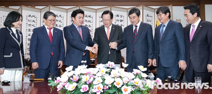 (서울=포커스뉴스) 2일 오후 서울 여의도 국회 의장실에서 진행된 예산안 및 법안 처리 관련 여야 원내지도부 중재 회담에 참석한 의원들이 취재진을 향해 포즈를 취하고 있다. 왼쪽부터 문정림 새누리당 원내대변인, 조원진 원내수석부대표, 원유철 원내대표, 정의화 국회의장, 이종걸 새정치민주연합 원내대표, 이춘석 원내수석부대표, 박수현 원내대변인.