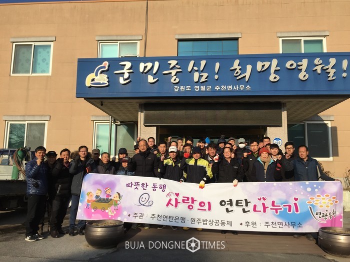 [부자동네타임즈 김민석기자]주천면 연탄은행(대표 정종옥)은 13일 주천면사무소 마당에 혹한기 주천지역 ‘사랑의 연탄나누기 행사’를 갖고 어려운 이웃에 연탄을 배달하였다.