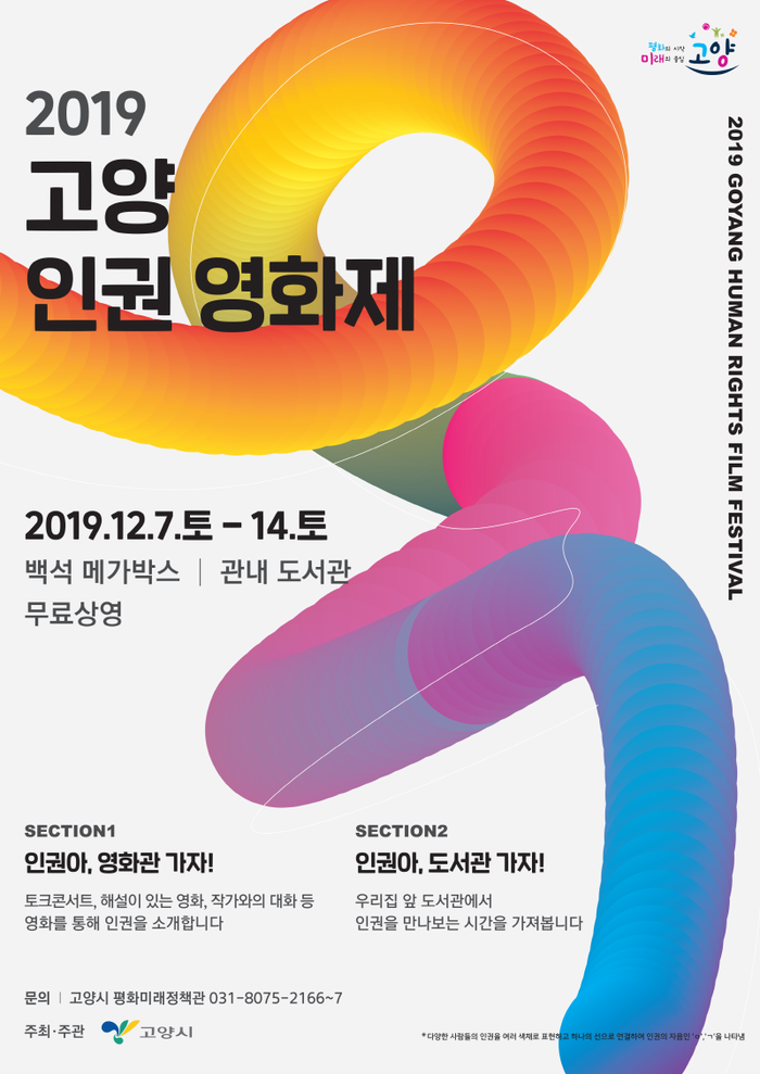 [부자동네타임즈 김인수기자] 고양시(시장 이재준)는 세계인권선언 71주년(12.10.)을 기념해 ‘2019 고양 인권 영화제’를 개최한다. 12월 9일부터 14일까지 백석 메가박스와 관내 7개 도서관에서 인권영화 상영 및 인권도서 전시를 진행한다.
