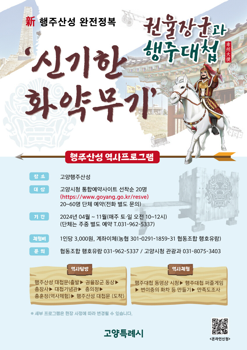 역사 프로그램 ‘권율장군과 행주대첩’은 행주산성의 역사에 대해 알아보고 체험해보는 프로그램으로 올해는 ‘신기한 화약무기’라는 주제로 진행된다.