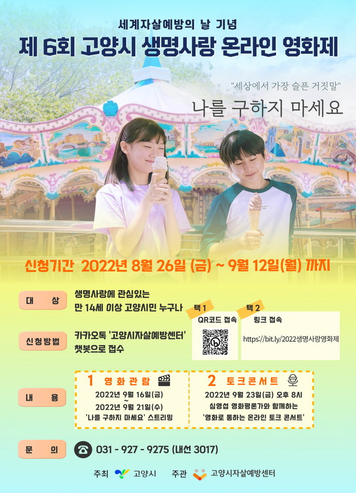 [부자동네타임즈 김인수기자] 고양특례시(시장 이동환) 자살예방센터가 세계자살예방의 날(매년 9월 10일)을 맞아 자살에 대한 인식개선 및 생명존중 문화 형성을 위해 제6회 고양시생명사랑영화제를 개최한다.