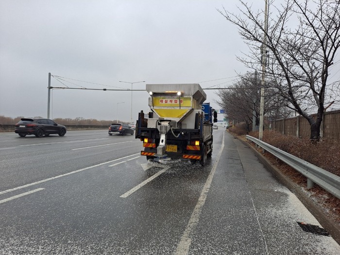 또한 15일(일) 오전에는 눈 날림에 따라 주요 IC에 사전살포를 실시하였으며, 이후 강설에 따라 이면도로 전 구역에 친환경 제설제 살포를 실시하였다.