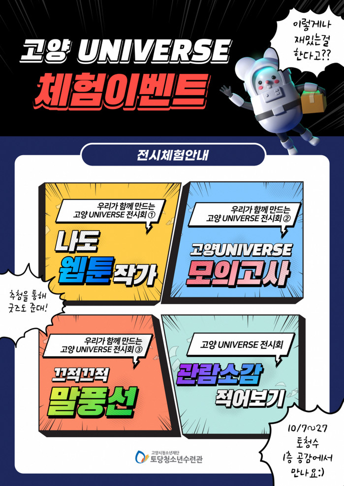 청소년 웹툰창작활동 ‘고양 UNIVERSE’는 고양시의 ‘고양’과 ‘또 다른 세계(행성)‘를 의미하는 말로, 지난 8월 여름방학동안 청소년이 ’고양시‘를 주제로 지역에 대해 탐구해보고 직접 세계관을 구상해보는 활동이다. 올해에는 총 13인의 청소년 작가가 웹툰을 창작하였으며, 또래 간 협업을 통해 총 6개의 작품이 탄생하였다.