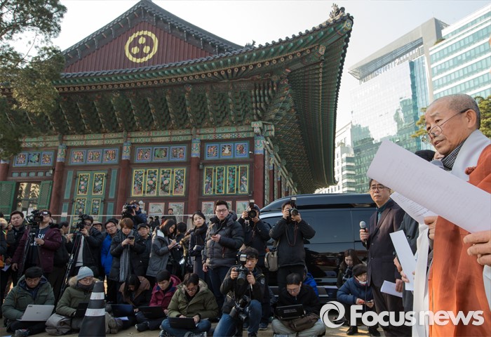 (서울=포커스뉴스) 8일 오전 서울 종로구 조계사에서 대한불교조계종 화쟁위원회 위원장인 도법 스님이 회견문을 읽고 있다.