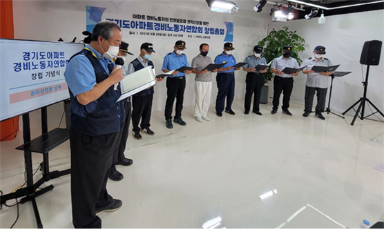 이날 창립총회 참가자들은 초단기 계약으로 인한 고용불안 대책 마련, 경비업체 변경 시 고용승계 법제화, 경비업무 외 다른 업무 수행에 따른 감시단속노동자 제외 등 총 7가지 요구가 담긴 경기도아파트경비노동자 권리선언을 발표했다.