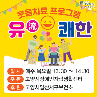 [부자동네타임즈 김인수기자] 고양특례시(시장 이동환) 일산서구보건소가 장애인 정신건강 증진을 위해 뇌병변 및 지체 장애인을 대상으로 ‘웃음치료 프로그램 유(流)쾌한’을 운영한다.