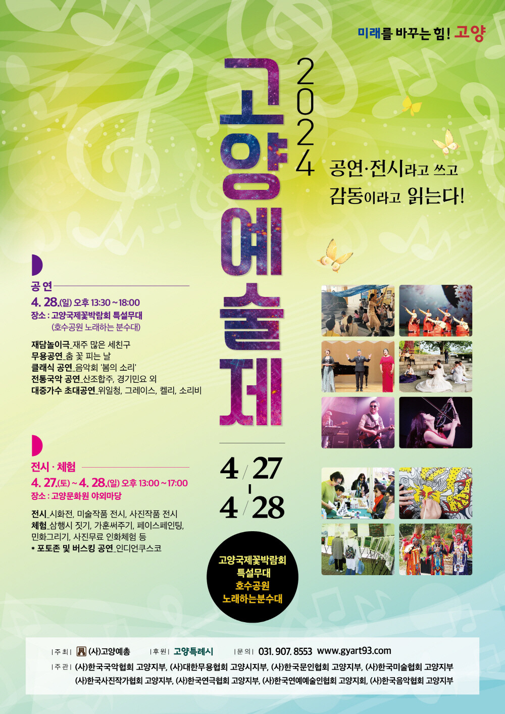 ‘공연·전시라고 쓰고 감동이라고 읽는다!’를 주제로 한 이번 예술제는 4월 28일 오후 1시 30분부터 6시까지 고양국제꽃박람회 특설무대(호수공원 노래하는 분수대)에서 국악, 무용, 연극, 연예, 음악 5개 분야의 공연이 펼쳐진다.