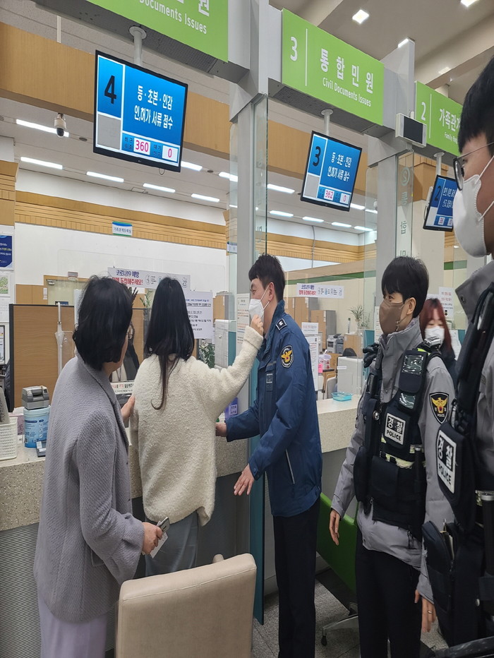 주요내용은 ▲긴급 상황 시 비상벨 정상 작동 여부 확인 ▲사전고지 후 녹음 및 촬영 ▲담당 공무원의 보호 및 민원인 대피 ▲가해 민원인 제압 ▲경찰 인계 순으로 실제 발생할 수 있는 위협 상황을 가정한 대응 요령 훈련이다.