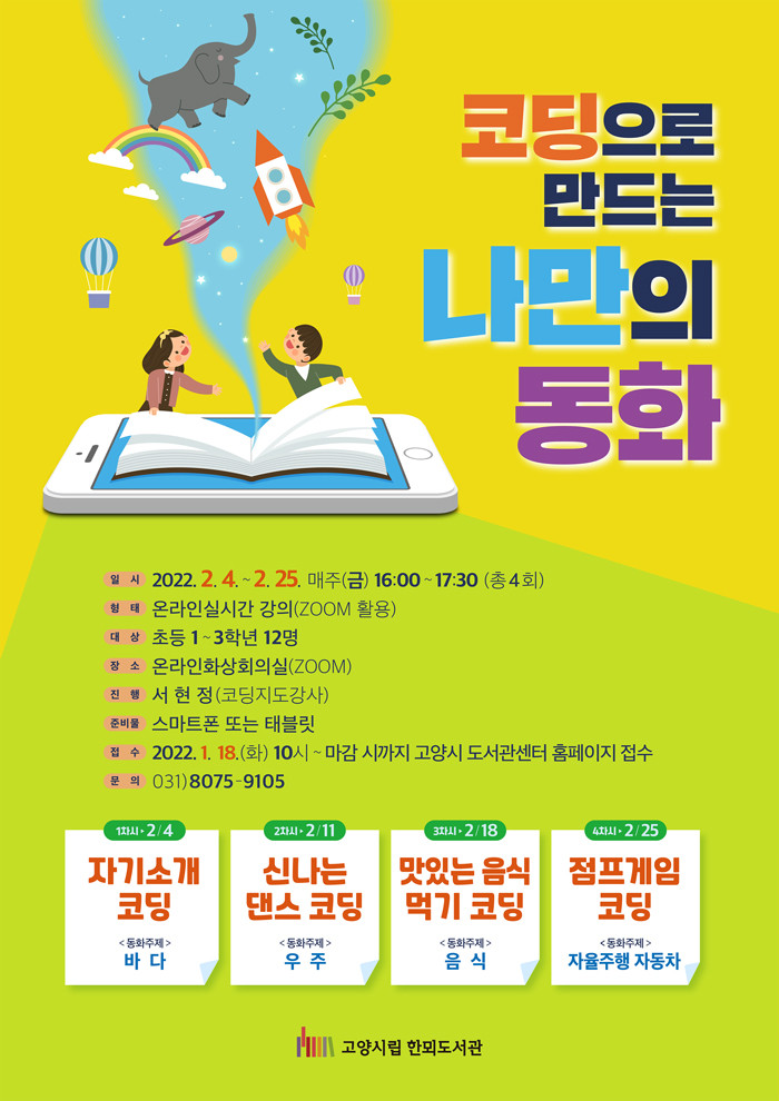 [부자동네타임즈 김인수기자] 고양시 한뫼도서관은 겨울 방학을 맞은 어린이들을 위해 그림책 연계 코딩 수업코딩으로 만드는 나만의 동화 프로그램을 온라인으로 운영한다.