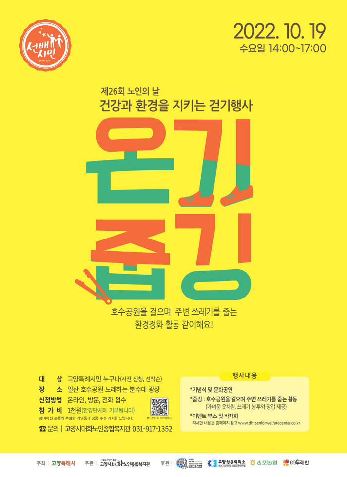 [부자동네타임즈 김인수기자] 제26회 노인의 날을 기념하여 10월 19일(수) 고양특례시가 주최하고 고양시대화노인종합복지관이 주관하는 건강과 환경을 지키는 걷기행사 ‘온기줍깅’이 열린다.