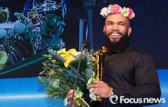 | △ 24일 오후 서울 서초구 The-k호텔에서 열린 '2015 KBO 시상식'에서 MVP를 수상한 에릭 테임즈(NC)가 수상 소감을 말하고 있다. <사진제공=포커스뉴스> |