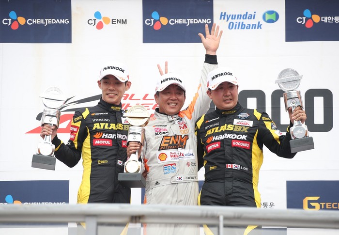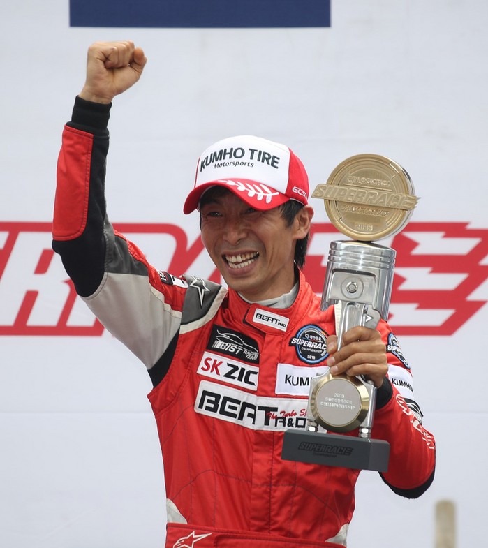 [사진설명] 2019 CJ대한통운 슈퍼레이스 챔피언십 6라운드 ASA 6000 클래스 시상식에서 조항우(오른쪽)와 김종겸(왼쪽)이 함께 포디움에 올랐다. 조항우는 3위를 했지만 예선 포인트 덕분에 2위 김종겸과 같은 점수를 획득했다.