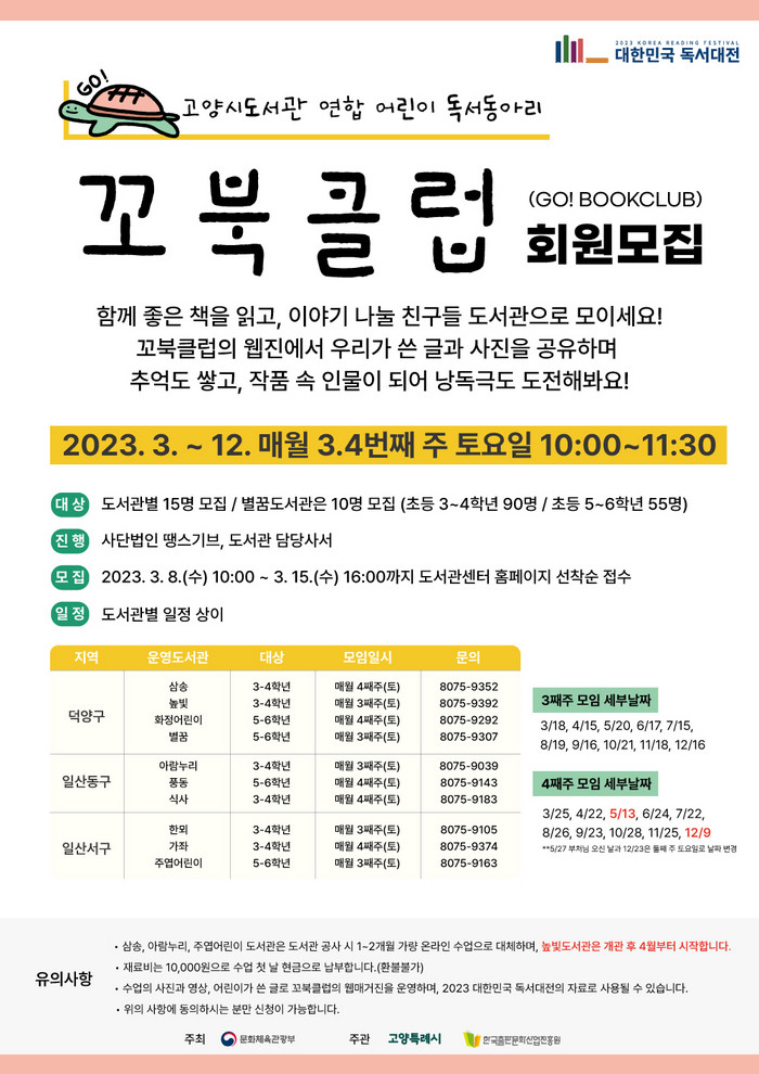 꼬북클럽 회원접수는 3월 8일(수) 오전 10시부터 3월 15일(수) 오후 4시까지 고양시도서관센터 홈페이지에서 할 수 있으며 기타 자세한 사항은 독서진흥팀으로 문의하면 된다.