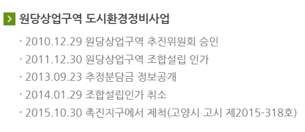 [자료 제공 고양시] 고양시 재정비촉진 사이트에 공개되어 있는 원당상업구역 사업 진행과정 및 촉진지구 제척 현황.