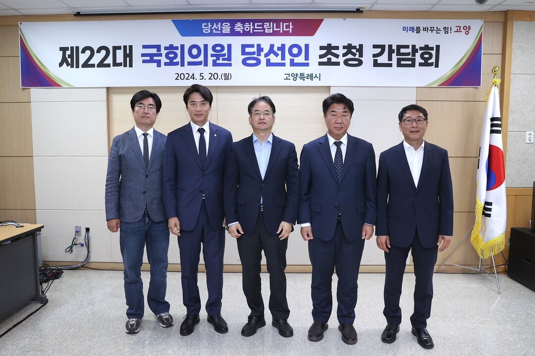 [사진설명] 제22대 국회의원 당선인 초청 간담회_(왼쪽부터)고양갑 김성회 국회의원, 고양을 한준호 국회의원, 이동환 고양특례시장, 고양병 이기헌 국회의원, 고양정 김영환 국회의원.