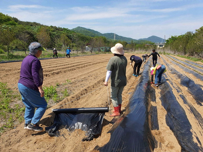 뜨거운 날씨 속에서도 활동에 참여한 주민자치회 위원 및 고문 13여 명은 행복텃밭 주변 정리 및 고랑 작업을 끝내고 각 고랑마다 비닐을 씌우는 작업으로 구슬땀을 흘렸다.