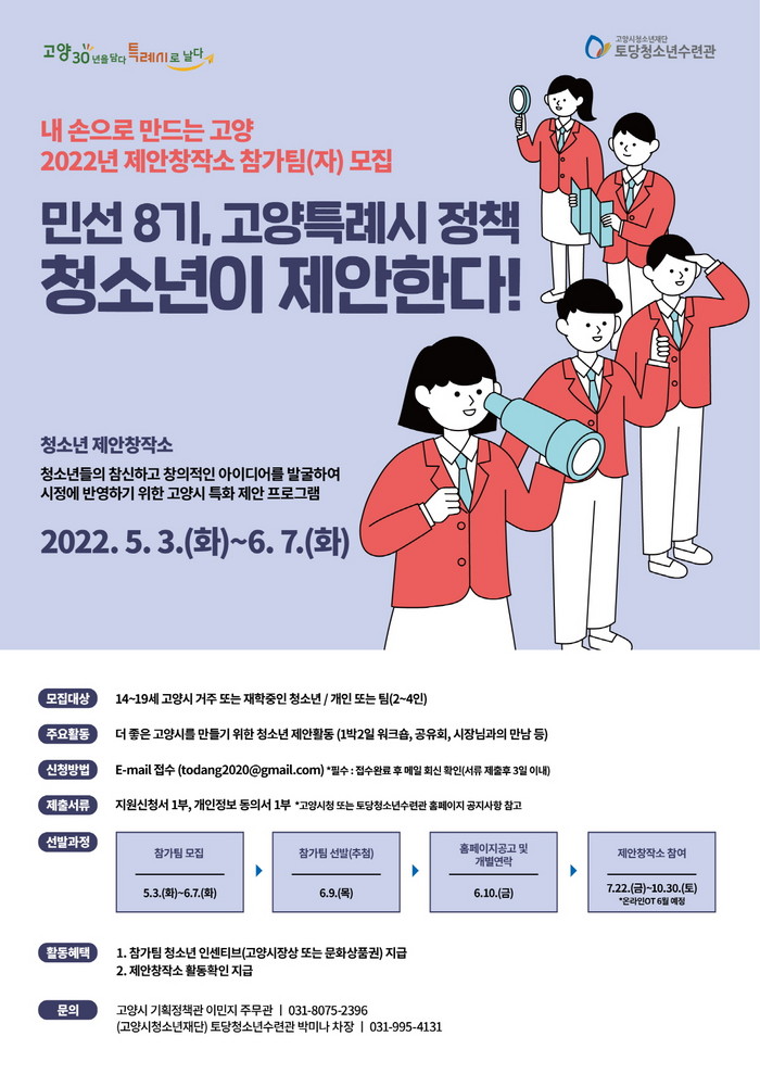 관련 문의는 고양시 기획정책관 그리고 토당청소년수련관으로 하면 된다.