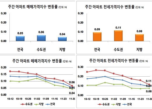 [부자동네타임즈 이채봉 기자] 전국 아파트 매매가격이 겨울철을 맞아 매수심리가 위축되며 올 들어 가장 낮은 상승률을 보였다.