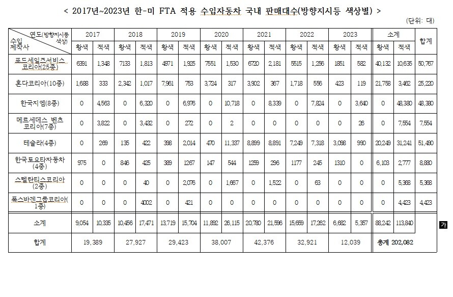 국회 국토교통위원회 소속 한준호 의원(더불어민주당, 경기 고양시(을))이 국토교통부로부터 제출받은 자료에 따르면, 2017년부터 2023년까지 국내 판매된 한-미 FTA 적용 차량 20만2082대 중 절반 이상(56.3%)이 적색 방향지시등을 달고 있는 것으로 나타났다. 우리나라 관계 법령 「자동차 및 자동차부품의 성능과 기준에 관한 규칙」 제44조 제2호에 규정된 방향지시등 색상은 호박색(황색)이다.