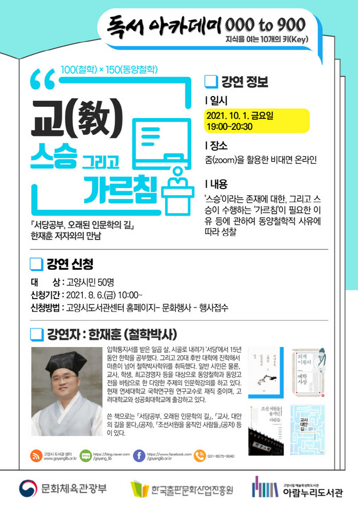 이번 강의는 줌(Zoom)을 통한 비대면 온라인 방식으로 진행되며, 수강 신청은 9월 28일(화) 오전 10시부터 고양시도서관센터 홈페이지를 통해 할 수 있다. 강연에 대한 추가 문의는 전화로 하면 된다.