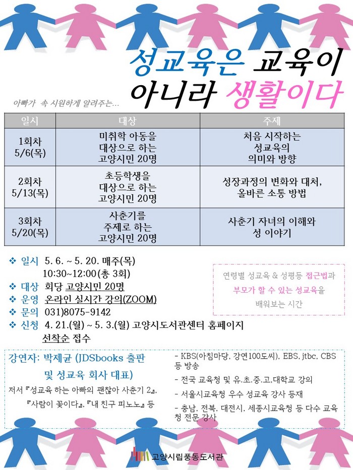 [부자동네타임즈 김인수기자] 고양시 풍동도서관은 ‘성교육은 교육이 아니라 생활이다’ 강연을 5월 6일부터 실시한다.