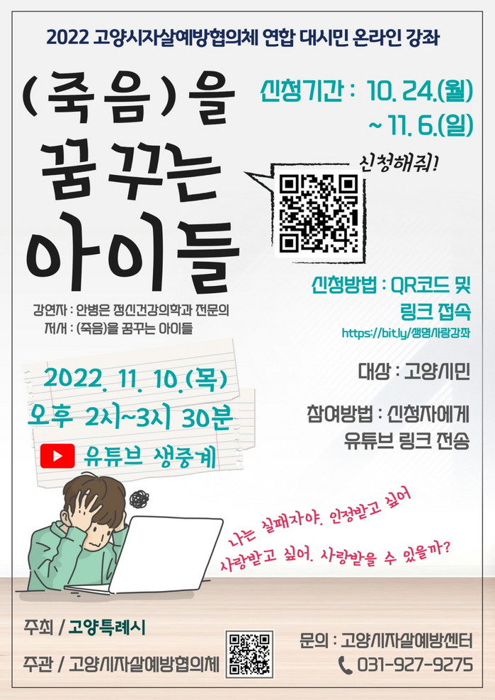[부자동네타임즈 김인수기자] 고양특례시(시장 이동환) 자살예방협의체가 자살예방에 대한 관심을 높이고 생명존중문화를 조성하고자 온라인 강좌 ‘(죽음)을 꿈꾸는 아이들’을 11월 10일(목) 오후 2시 실시간 유튜브로 진행한다.