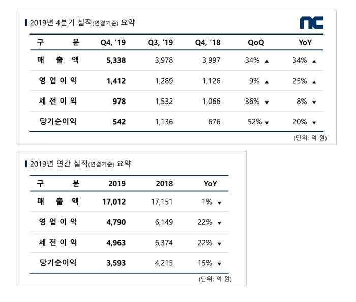[부자동네타임즈 김인수기자] ㈜엔씨소프트(대표 김택진, 이하 엔씨(NC))가 2019년 연간 실적 결산(이하 연결기준) 결과 매출 1조 7,012억원, 영업이익 4,790억 원, 당기순이익 3,593억 원을 기록했다.
