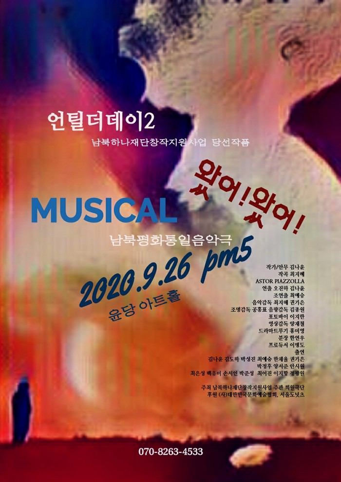 [부자동네타임즈 김인수기자] 뮤지컬 ‘언틸더데이' 의 제작팀인 희원극단이 올해 또 하나의 통일뮤지컬인 '왔어 왔어' 를 제작, 발표한다. ‘언틸더데이' 는 2011년 개막공연 이후 8년간 무대에 올려졌으며 북한지하교인들의 실화라는 다소 무거운 주제를 다루었지만 입소문을 타고 전해져 3만명 이상이라는 최다관객을 동원한 뮤지컬이다.