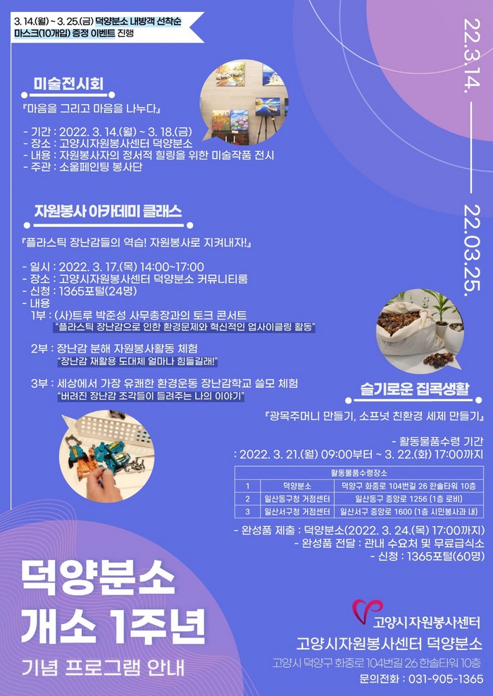 센터는 감사의 마음과 개소 1주년 기념으로 미술전시회 및 자원봉사 아카데미 클래스, 슬기로운 집콕생활 비대면 프로그램, 방문기념 마스크 제공까지 다양한 행사를 펼치고 있다. 진행되는 프로그램은 1365자원봉사포털 내에서 신청이 가능하다.