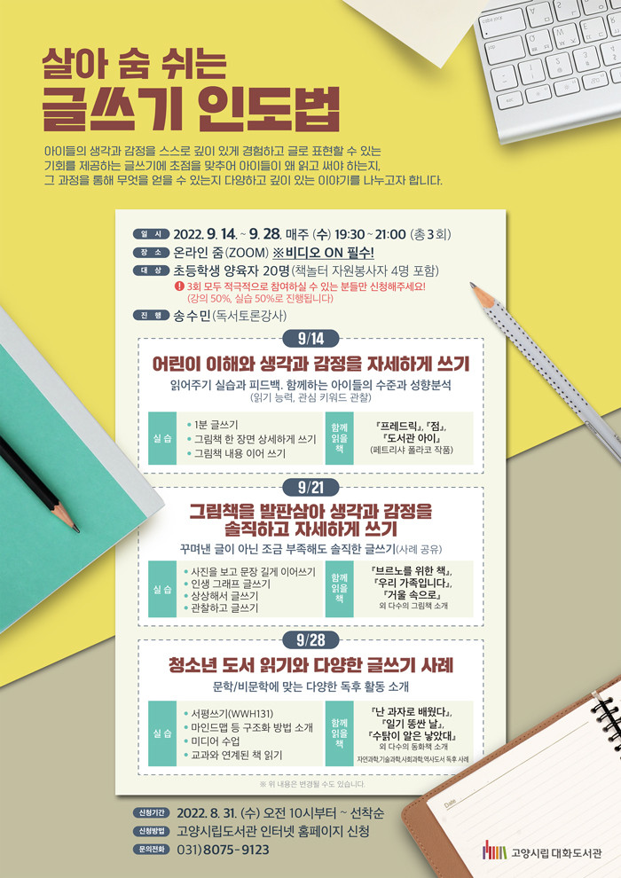 [부자동네타임즈 김인수기자] 고양특례시(시장 이동환) 대화도서관이 초등학생 양육자를 대상으로 초등학교 중, 고학년 글쓰기 지도법을 배워보는 「살아 숨 쉬는 글쓰기 인도법」을 9월 14일부터 9월 28일까지 운영한다.