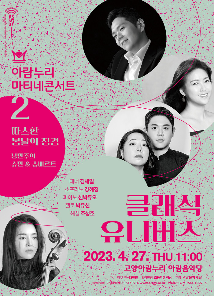 [부자동네타임즈 김인수기자] 고양문화재단은 2023 고양아람누리 마티네콘서트의 두 번째 공연 클래식 유니버스 2 따스한 봄날의 정경을 4월 27일(목), 고양아람누리 아람음악당에서 선보인다.