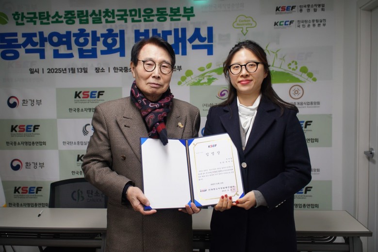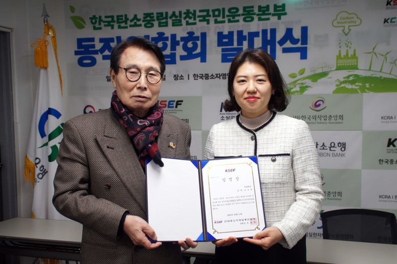 | ▲지난 13일 한국탄소중립실천국민운동본부 동작구연합회의 발대식이 열린 가운데 오호석 총회장(좌)과 박미나 지부장(우)이 기념사진을 찍고 있다. [사진 제공 = 한국탄소중립실천국민운동본부] |