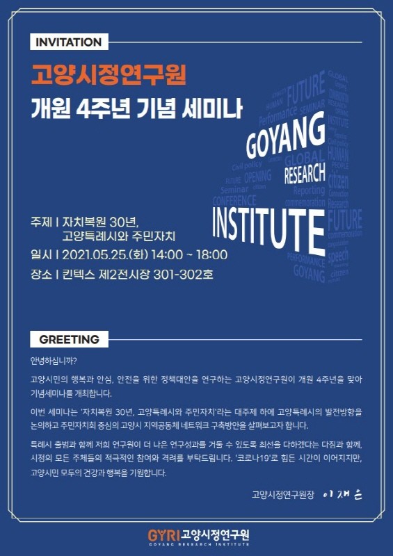 [부자동네타임즈 김인수기자] 고양시정연구원은 "오는 25일 오후 2시부터 킨텍스 제2전시장 ‘개원 4주년기념 세미나’를 개최한다."고 밝혔다.