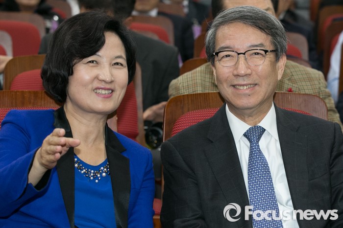 (서울=포커스뉴스) 정운찬(오른쪽) 전 총리와 추미애 새정치민주연합 최고위원이 9일 오후 서울 여의도 국회 의원회관에서 열린 꿈보따리 정책연구원 창립 2주년 심포지엄에 참석해 대화하고 있다.