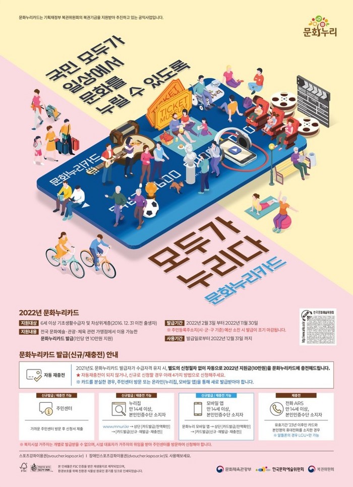 저소득층의 문화생활 향상을 위한 통합문화이용권 ‘문화누리카드’ 지원 대상이 올해 6세 이상(2016.12.31.)의 모든 저소득층으로 확대 시행되어 4인 가구 기준 연 40만원이 지원된다.