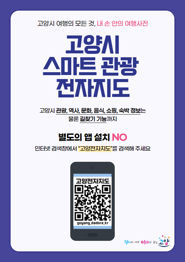 고양시 스마트 관광 전자지도는 직관성 높은 인터페이스와 장소의 특징을 잘 살린 아이콘이 특징이다. 누구나 쉽고 간편하게 지역 내 관광지·역사·문화·음식·쇼핑·숙박 정보를 검색할 수 있다.