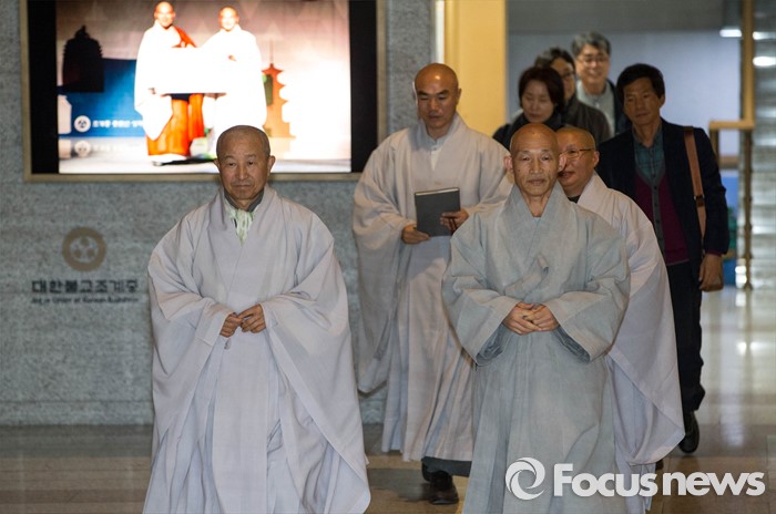 | △ 19일 오후 종로구 조계사에서 조계종 화쟁위원회 위원장 도법 스님(왼쪽)이 ‘민중총궐기’ 시위 이후 조계사로 피신한 한상균 민주노총 위원장의 신변보호 요청에 대한 논의를 하기 위해 열린 화쟁위에 참석하고 있다. <사진제공=포커스뉴스> |