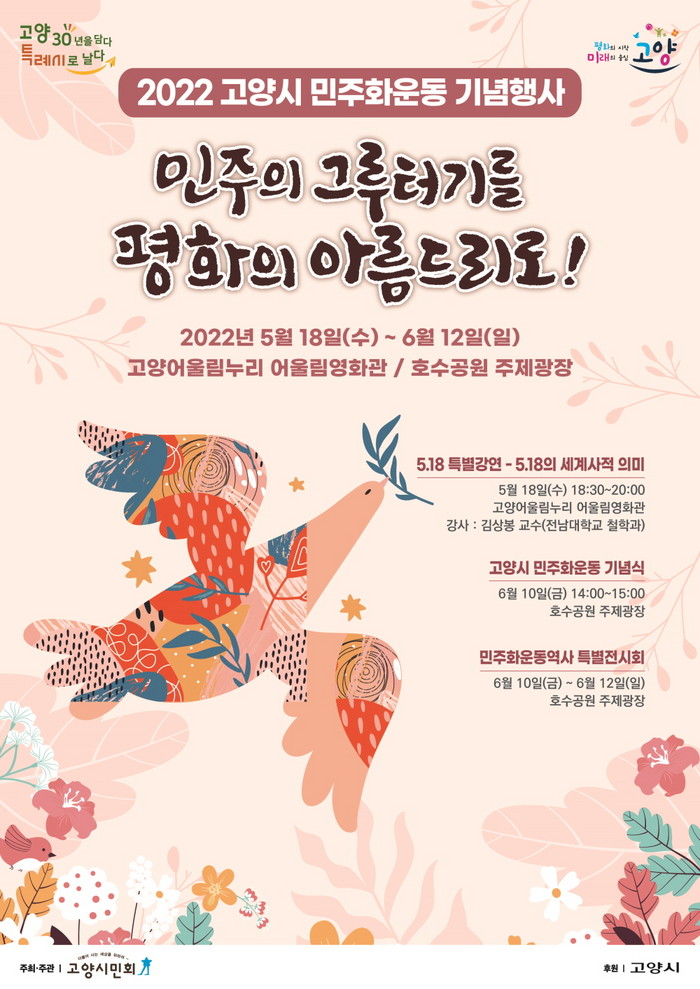 시 관계자는 “어제보다 더 나은 내일을 위해 투쟁했던 많은 분들의 숭고한 희생이 있었기에 오늘날 민주주의가 있고 더 다양한 인권에 대해 이야기할 수 있는 사회로 나아가고 있다”며“고양시는 민주화운동의 역사를 기념하고, 일상의 민주주의 실현을 위한 사업을 지속적으로 추진할 것이다.민주화운동 기념행사 및 교육에 시민들의 많은 관심과 참여를 바란다”고 말했다.